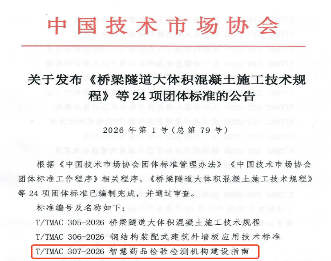 近日,由泰州市药品检验院牵头,联合省内多家药检机构共同起草的《智慧药品检验检测机构建设指南》(T/TMAC307-2026)团体标准,经中国技术市场协会专家评审后正式发布。作为国内首个聚焦智慧药检机构建设的团体标准,填补了行业数智化建设标准空白,为生物医药产业数智化转型升级注入新动能。